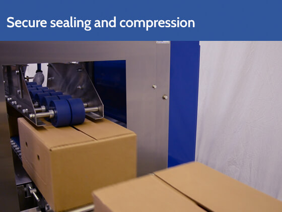 Case flaps are compressed by flexible rollers to secure the hot melt bond. The rollers accommodate case height variations to ensure a secure seal on every case.