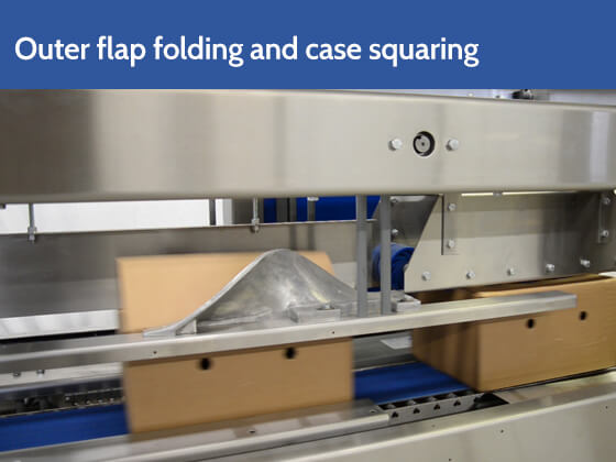 Outer flaps are guided closed by contoured folders while a squaring bar eliminates flap overlap. This design is proven to deliver square cases for stable palletloads.